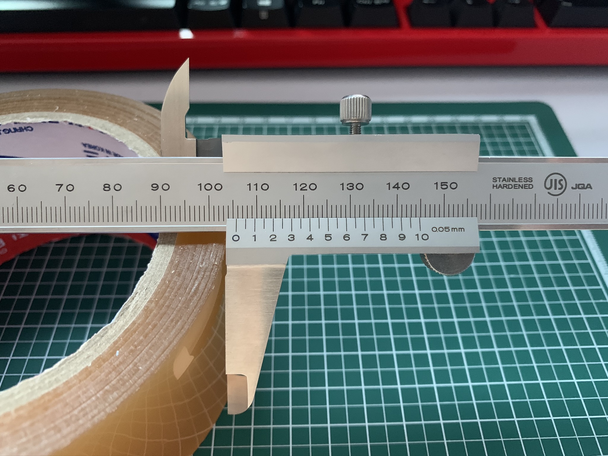 외경 측정치는 어미자 105mm와 아들자 0.7mm(0.05 x 14)를 더해서 105.7mm이다.