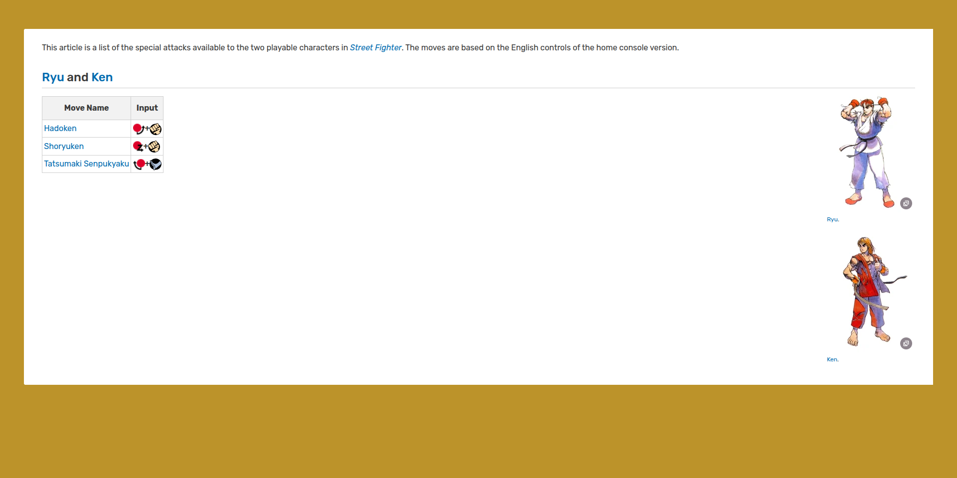 This article is a list of the special attacks available to the two playable characters in Street Fighter. The moves are based on the English controls of the home console version.
